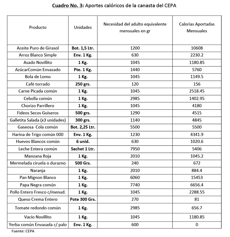 La canasta de bienes relevada fue elaborada por el Centro de Economía Política Argentina (CEPA) y consta con una estructura similar a la canasta básica alimentaria del INDEC previoa 2016. La metodología detrás de la constitución de la canasta básica alimentaria es la más común e internacionalmente aceptada basada en requerimientos calóricos de la población. En concreto, se adoptaron los requerimientos calóricos necesarios resultado de la investigación sobre la pobreza en Argentina del INDEC de 1988. El cuadro No. 3 indica dichos valores. A partir de los valores energéticos se constituyó una canasta básica alimentaria(CBA), que contiene los mismos alimentos y cantidades de la canasta básica alimentaria (CBA) del INDEC con algunos remplazos que no alteran los requerimiento scalóricos: (i) el té se remplaza por café; (ii) la batata por papa; (iii) las galletitas dulces por galletitas saladas; (iv) otras harinas por harina de trigo; (v) legumbres secas por arroz común; y (vi) no se incluyó sal y vinagre.