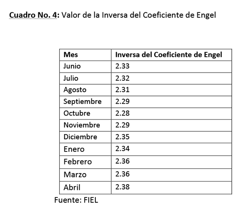La suma total del hogar son 3,36 unidades consumidoras o adultos equivalentes.La inversa del coeficiente de Engels utilizado para obtener el valor de la canasta básicatotal de la canasta básica alimentaria es de la Fundación de Investigaciones Económica Latinoamericanas (FIEL) (2).