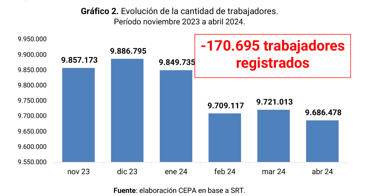 [1] A fin de junio, los datos publicados por la Superintendencia de Riesgos del Trabajo y Ministerio de Trabajo correspondían a las masas salariales y cantidad de trabajadores en el mes de abril 2024.