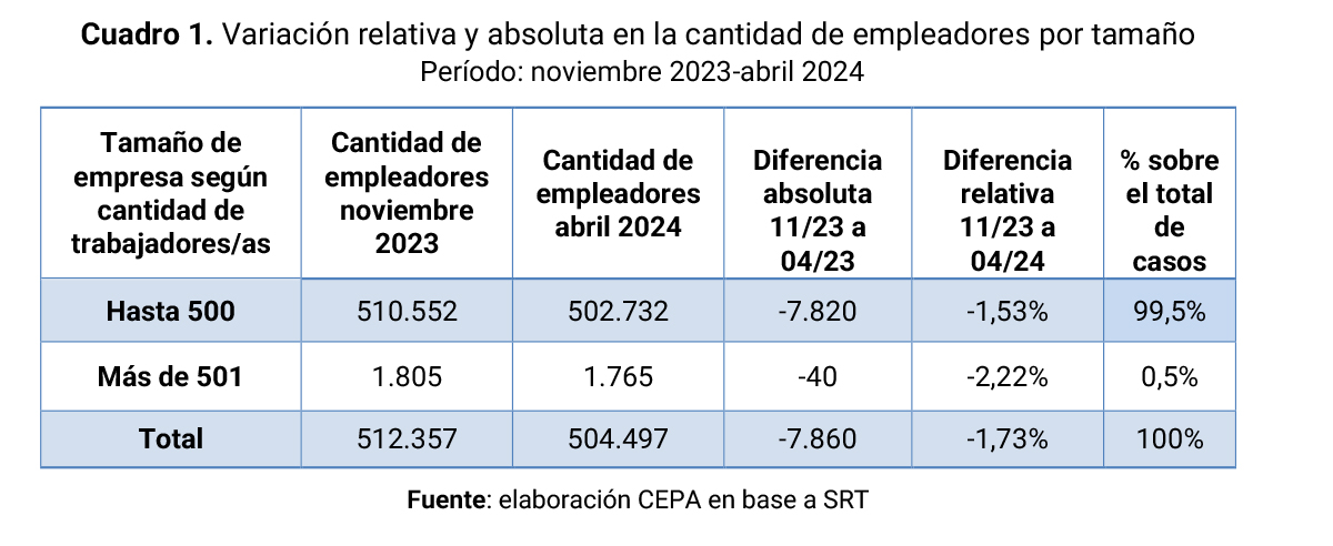 - Entre noviembre de 2023 y abril de 2024, se redujo la cantidad de empleadores en 7.860 casos.