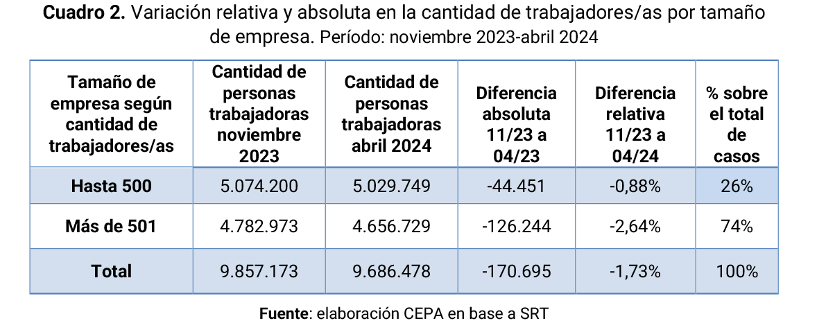 En términos porcentuales, mientras que las empresas de más de 500 trabajadores/as redujeron su personal 2,64% (de 4.782.973 a 4.656.729), las empresas de hasta 500 disminuyeron su dotación 0,88% (de 5.074.200 a 5.029.749).