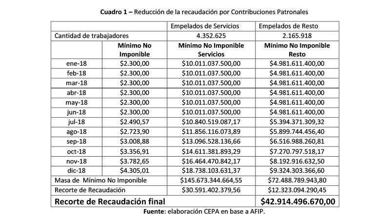 Por la rebaja de las contribuciones patronales implementadas a partir de 1994 el Estado dejó de recaudar 47.939 millones de pesos. Si se actualiza dicho monto por la inflación (al año 2005), el monto total acumulado no ingresado a la Seguridad Social rondaba los 80.000 millones de pesos. De ese total, en 2005 más de la mitad correspondía al sistema jubilatorio, mientras que el resto se repartía entre asignaciones familiares, Fondo Nacional de Empleo, PAMI y Obras Sociales, según datos de la Secretaría de Seguridad Social (5).